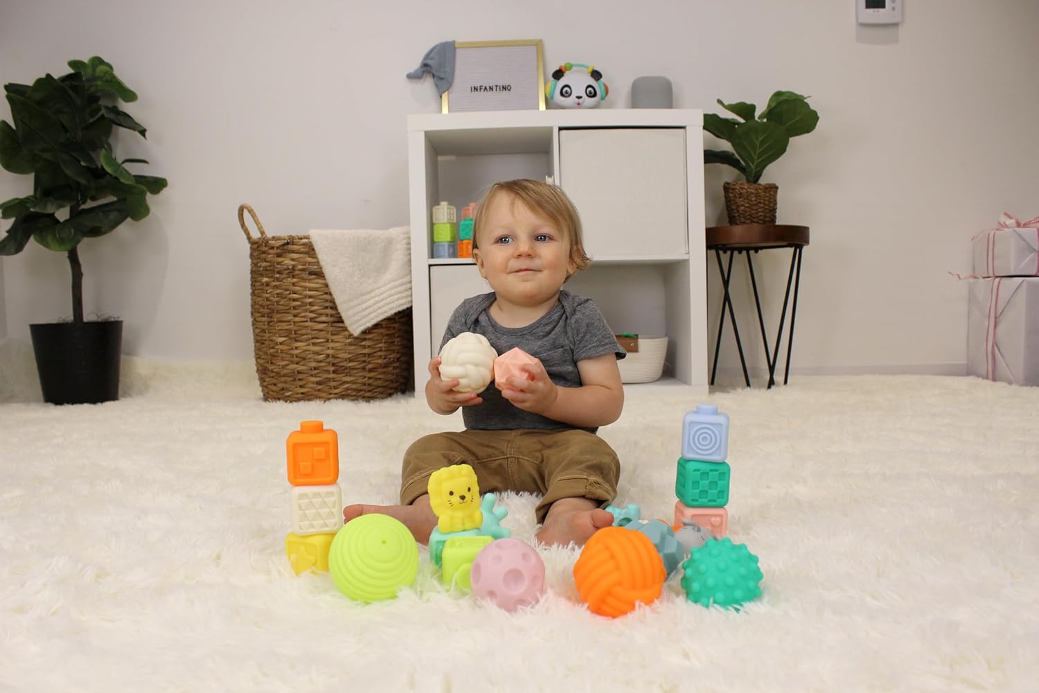 ● Bao gồm 8 khối vuông, 4 con vật, 8 quả bóng với bề mặt gồ ghề, trơn bóng, lõm, gai nhọn,… dễ cầm nắm giúp bé phát triển kỹ năng vận động